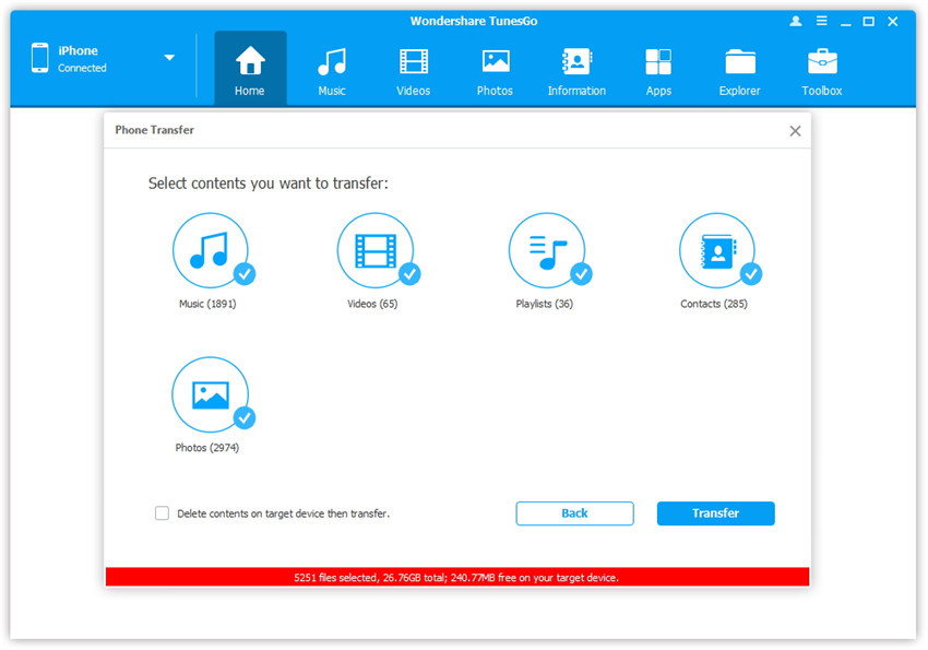 TunesGO è un software per PC e Mac progettato per gestire iPhone/iPad/iPod da PC. Infatti tutti i possessori di iPod e iPad e che desiderano effettuare un trasferimento/copia dei file tra i due dispositivi potranno usare questo programma. Il trasferimento con TunesGO avviene semplicemente collegando i due dispositivi al computer e poi scegliendo i dati da trasferire. Non bisogna far altro che selezionare i files da copiare e spostarli da una parte all’altra. Tutto questo senza bisogno di usare iTunes!